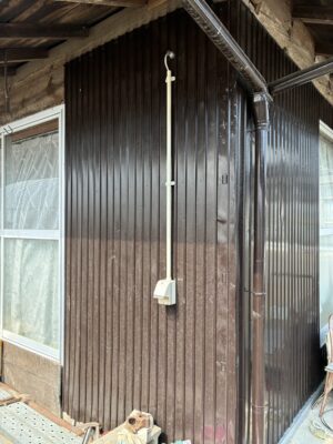 建物の壁をじっくり見ていたら、ちょうど取り付け希望場所の裏手あたりに、昔使っていた「引き紐タイプの照明」の跡を見つけました。今は使っていないとのことでしたが、中を確認するとしっかり電気が来ています。これなら、この電源を分岐させて外側に持ってくるのが一番効率的です。